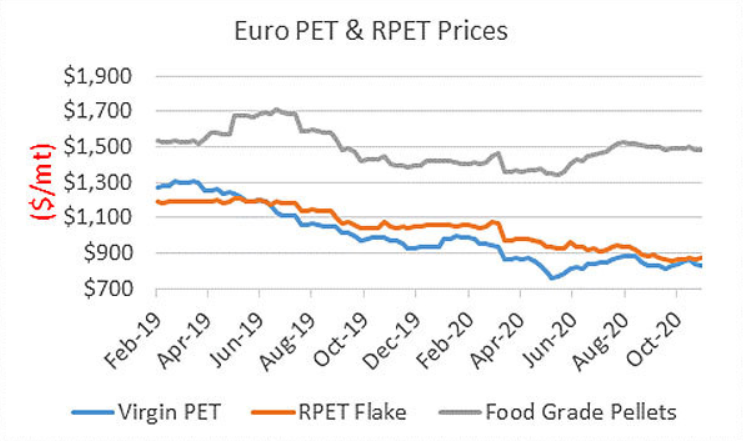 This investment activity runs counter to the fact that cost of virgin plastic has plummeted (due to crashing oil prices caused by the COVID-19 pandemic along with a supply glut caused by US fracking technology and a Saudi-Russia price war), making it theoretically less attractive to purchase recycled PET. The price of recycled PET flakes (used products are shredded into flakes before being transformed into pellets, which are then manufactured into new products) has indeed fallen in line with virgin PET. However, the price of recycled pellets has held up impressively over last few years, maintaining a roughly 50% premium over virgin material for food grade pellets.[x] This price divergence suggests buyers differentiate between virgin and recycled materials, but recyclers must be “closer” to the end user in order to realize such premiums.