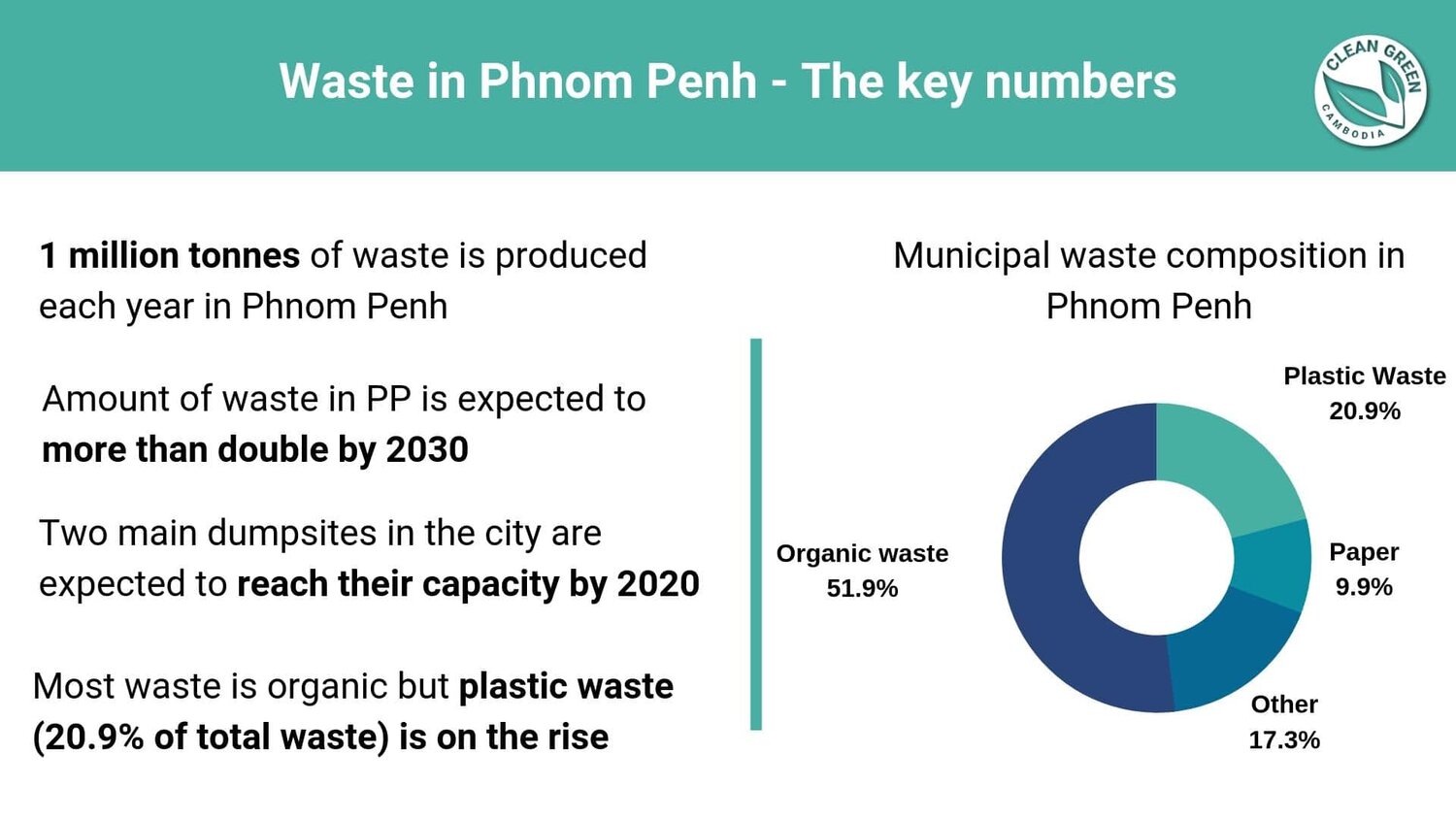 According to a recent report by Clean Green Cambodia (see graphic below)[ii], Phnom Penh generates 1 million tons of municipal waste per year, which is over a quarter of the country’s total waste. While most of this waste is organic (52%), plastic waste (21%) is on the rise. Robust data on recycling in the country is hard to come by, but most estimates predict less than 10% of all waste in Cambodia is recycled. The recycling system is based on an informal supply chain that goes from Edjai (informal waste collectors) to small collection centers to larger recycling depots that consolidate and compress materials into bulk quantities that are ultimately exported to neighboring countries where the actual chemical and mechanical processes take place. However, the capacity to export is expected to decrease significantly as neighboring countries respond to their own increasing waste issues by limiting and/or banning imports. Following China’s decision to ban most imported solid waste in 2017, Vietnam stopped issuing licenses to import plastic waste in 2018 and announced it will ban all imports by 2025; Thailand is expected to ban plastic waste imports in 2021.